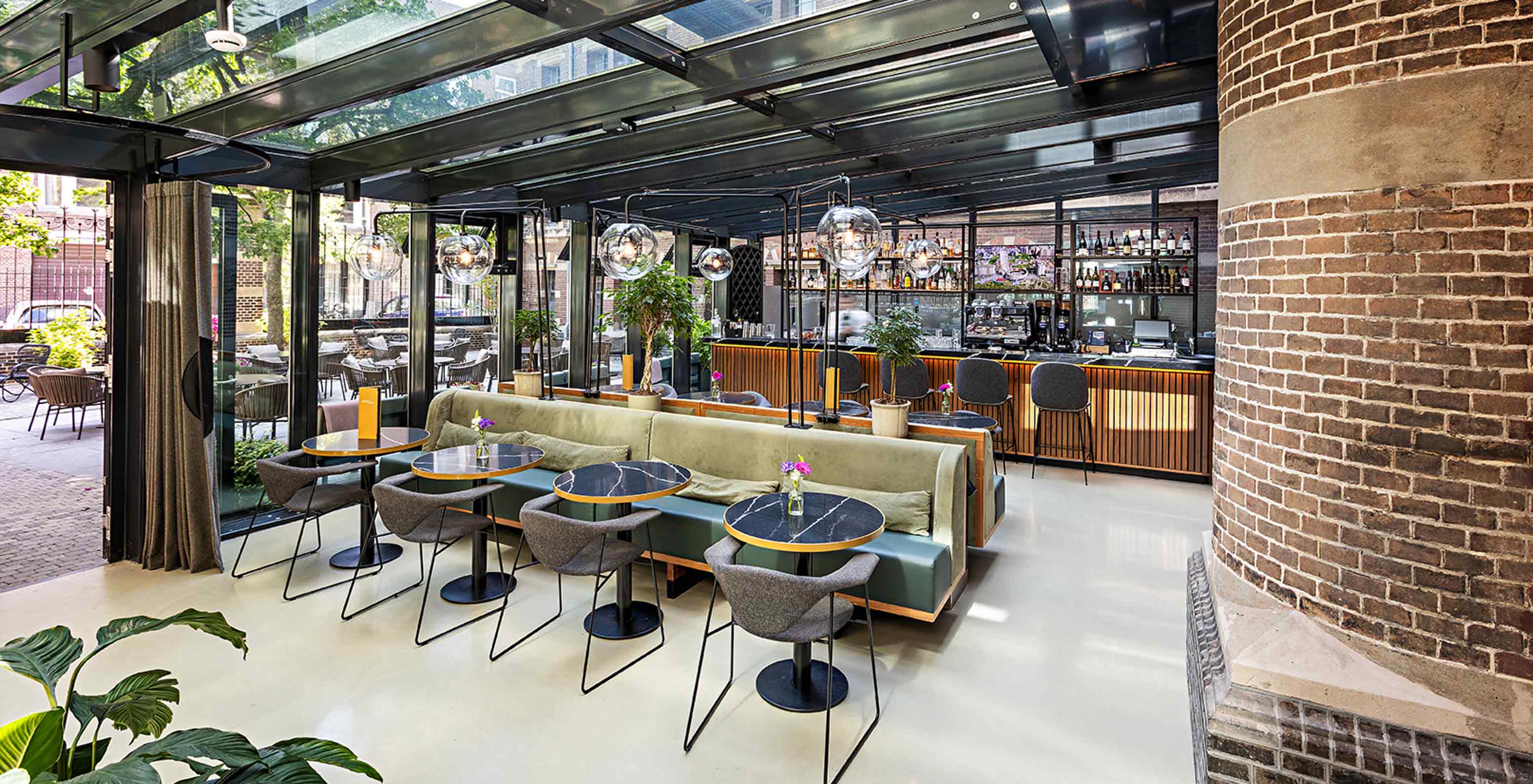 The Pestana Amsterdam Riverside has a restaurant with tables and sofas and a glass structure