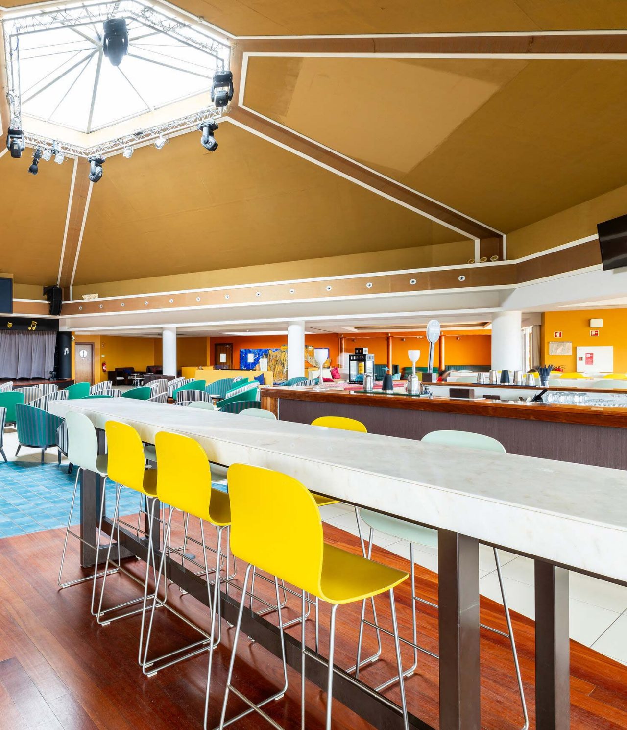 Informele eetzaal van Pestana Porto Santo All Inclusive met verschillende vierkante tafels en stoelen